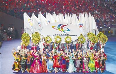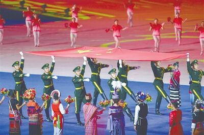 古都郑州华灯璀璨,中原大地万众欢腾。奥林匹克体育中心体育场内,56个民族齐聚一堂,共同奏响团结奋进的昂扬乐章。20时,开幕式正式开始,各代表团和现场近4万名观众迎接国旗仪仗队入场。各民族运动员身着民族盛装,精神抖擞,阔步走来。各代表团行进中30秒的驻停表演,展示了中华文化百花园的绚丽多姿,让现场观众赞叹沉醉。