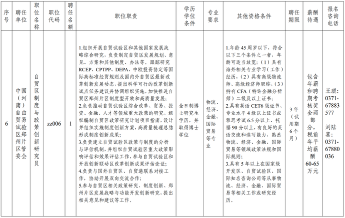 (六)中国(河南)自由贸易试验区郑州片区管委会自贸区制度与政策创新研究员1名;