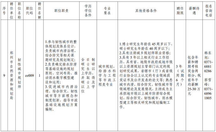 (九)郑州市自然资源和规划局韧性城市规划师1名。