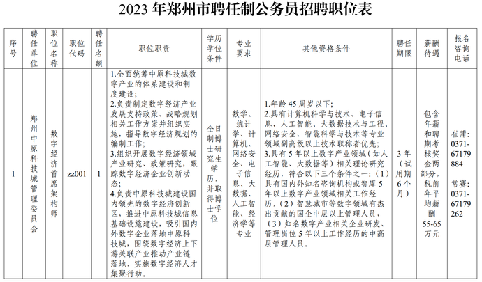 (一)郑州中原科技城管理委员会数字经济首席架构师1名;