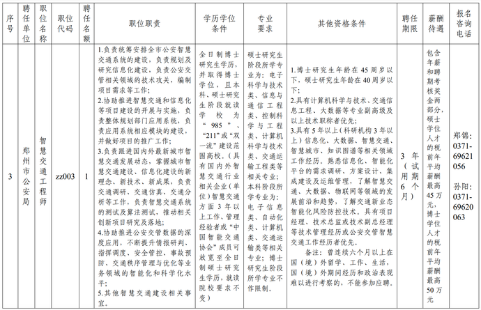 (三)郑州市公安局智慧交通工程师1名;