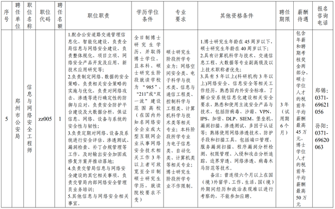 (五)郑州市公安局信息与网络安全工程师1名;
