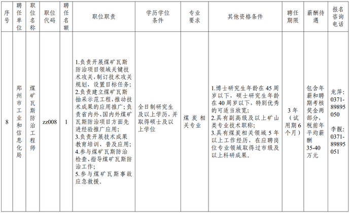 (八)郑州市工业和信息化局煤矿瓦斯防治工程师1名;