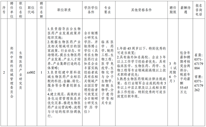 (二)郑州中原科技城管理委员会生物医药产业研究员1名;