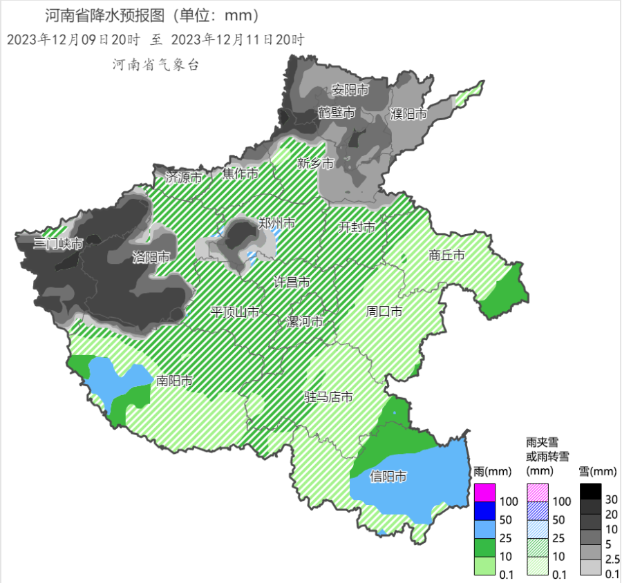 据河南省气象台预报,今天(12月9日)夜里,郑州阴天转小雨,明天(12月10日)雨夹雪转中到大雪,局部大到暴雪。
