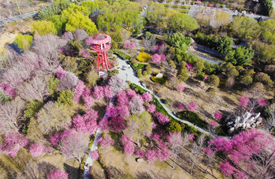 3月25日,郑州绿博园内,千余株美人梅盛放,花开成片、暗香扑鼻,粉嫩的花朵像蝴蝶般在风中轻舞,为春日的绿博园再添一场粉色浪漫。