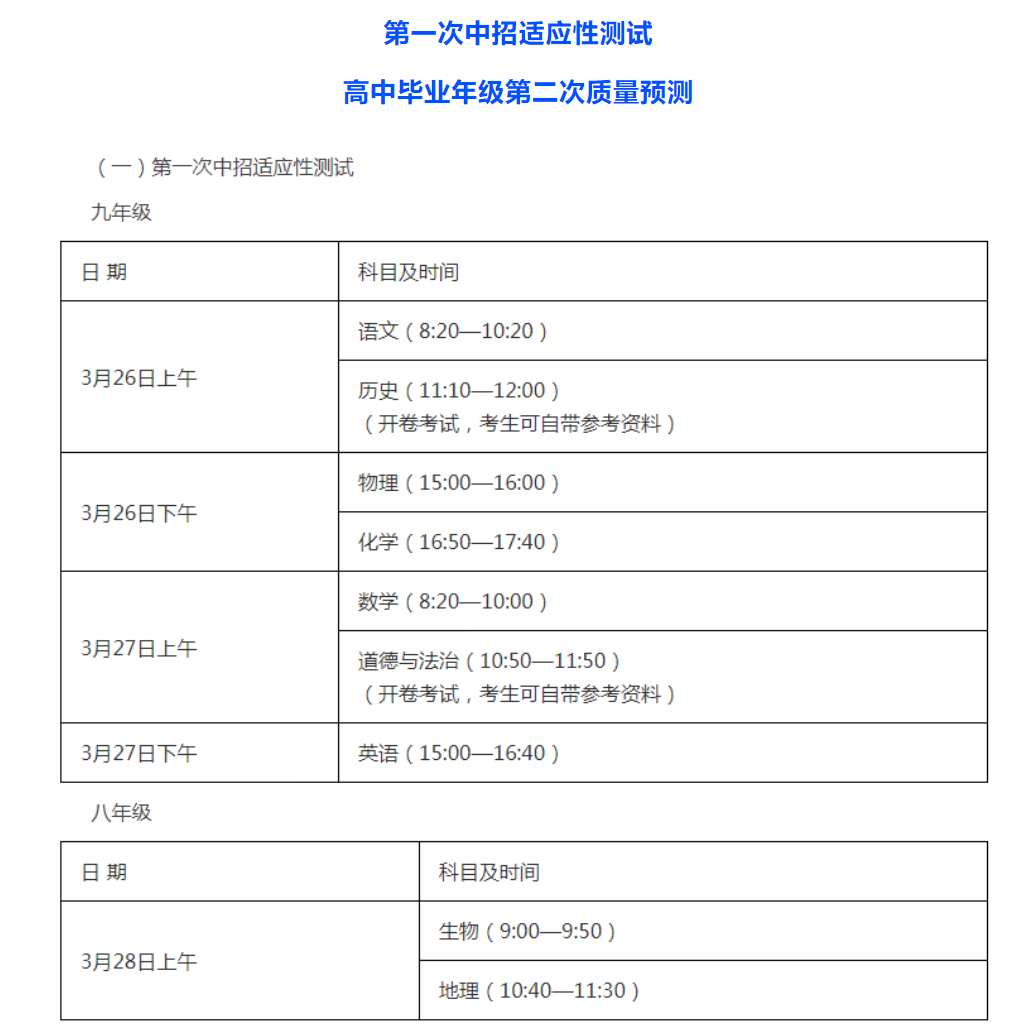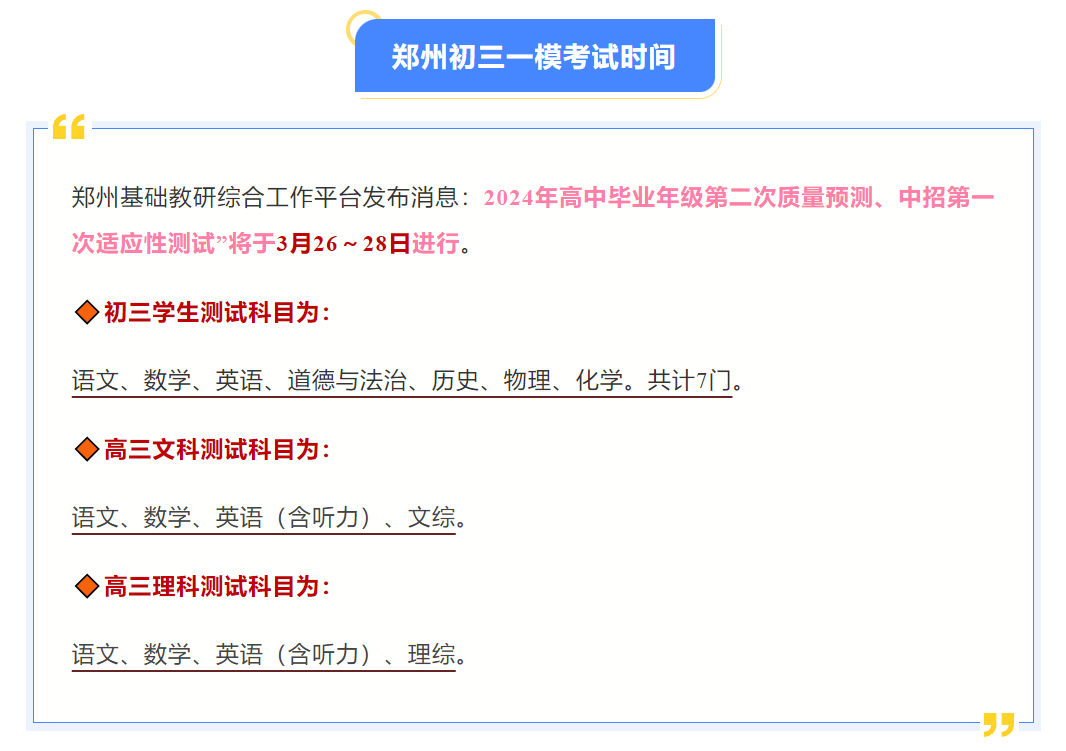 日前,郑州基础教研综合工作平台发布消息:2024年高中毕业年级第二次质量预测、中招第一次适应性测试”将于3月26日~28日进行。