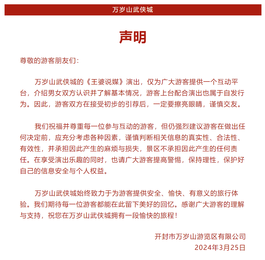 3月25日,开封万岁山武侠城发布《声明》,仅提供互动平台,建议游客在接受初步的引荐后,一定要擦亮眼睛,谨慎交友,景区不承担因此产生的任何责任。