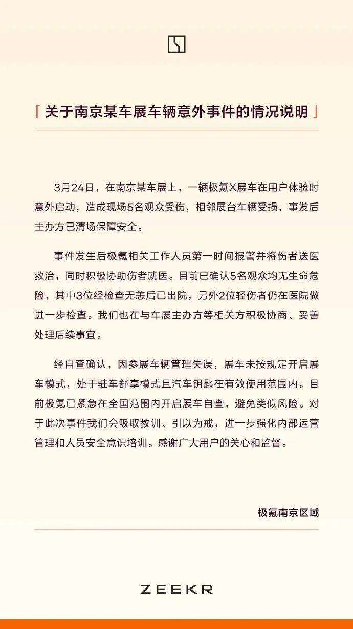 3月24日,南京一辆极氪展车意外启动,造成5名观众受伤。极氪回应:展车未按规定开启展车模式。