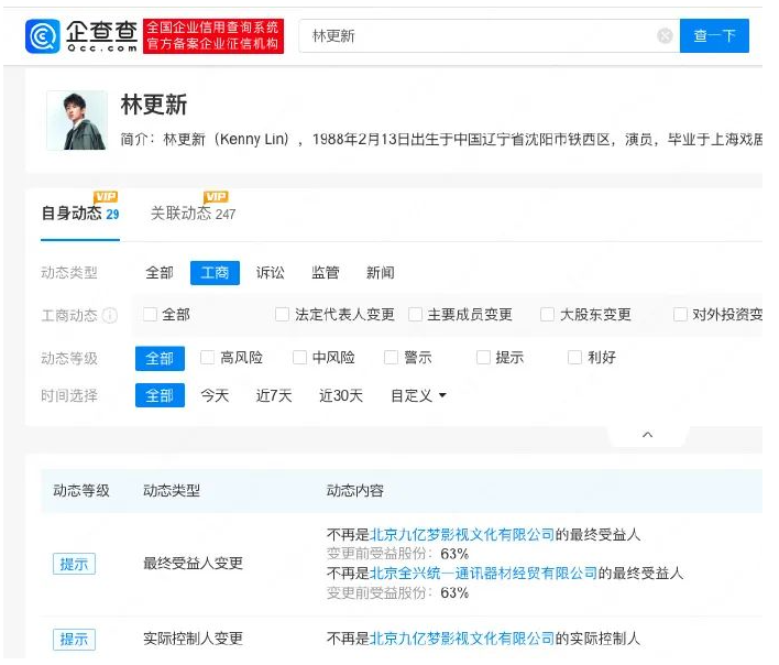 据某APP显示,北京九亿梦影视文化有限公司发生工商变更,大股东从由林更新持股90%的沈阳安然文化传媒有限责任公司变更为徐志莹,林更新不再是实际控制人。据了解,林更新被称为“九亿少女的梦”,这一昵称起源于他在游戏《英雄联盟》中的游戏ID。