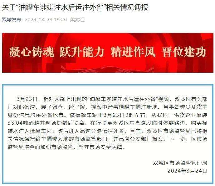 3月24日,哈尔滨市监局就“油罐车涉嫌注水后运往外省”发布通报:已将相关情况通报给车辆驶入地的市场监管部门,并已向公安部门报案。