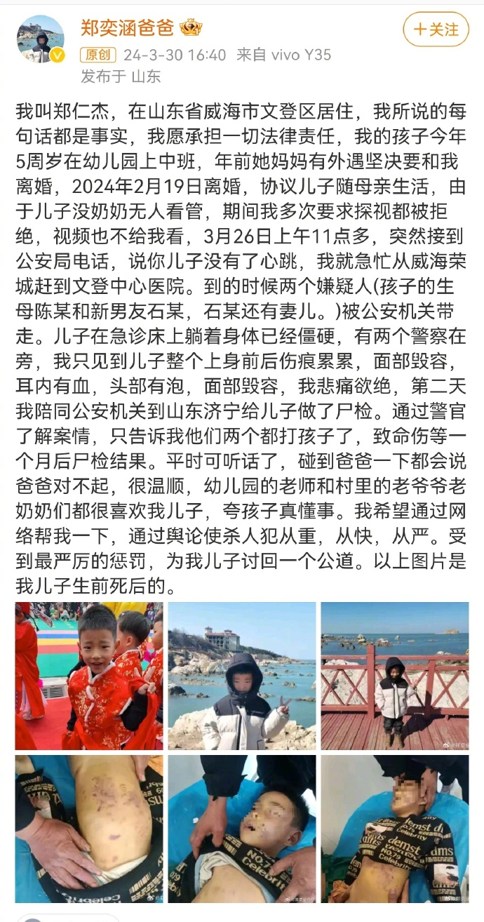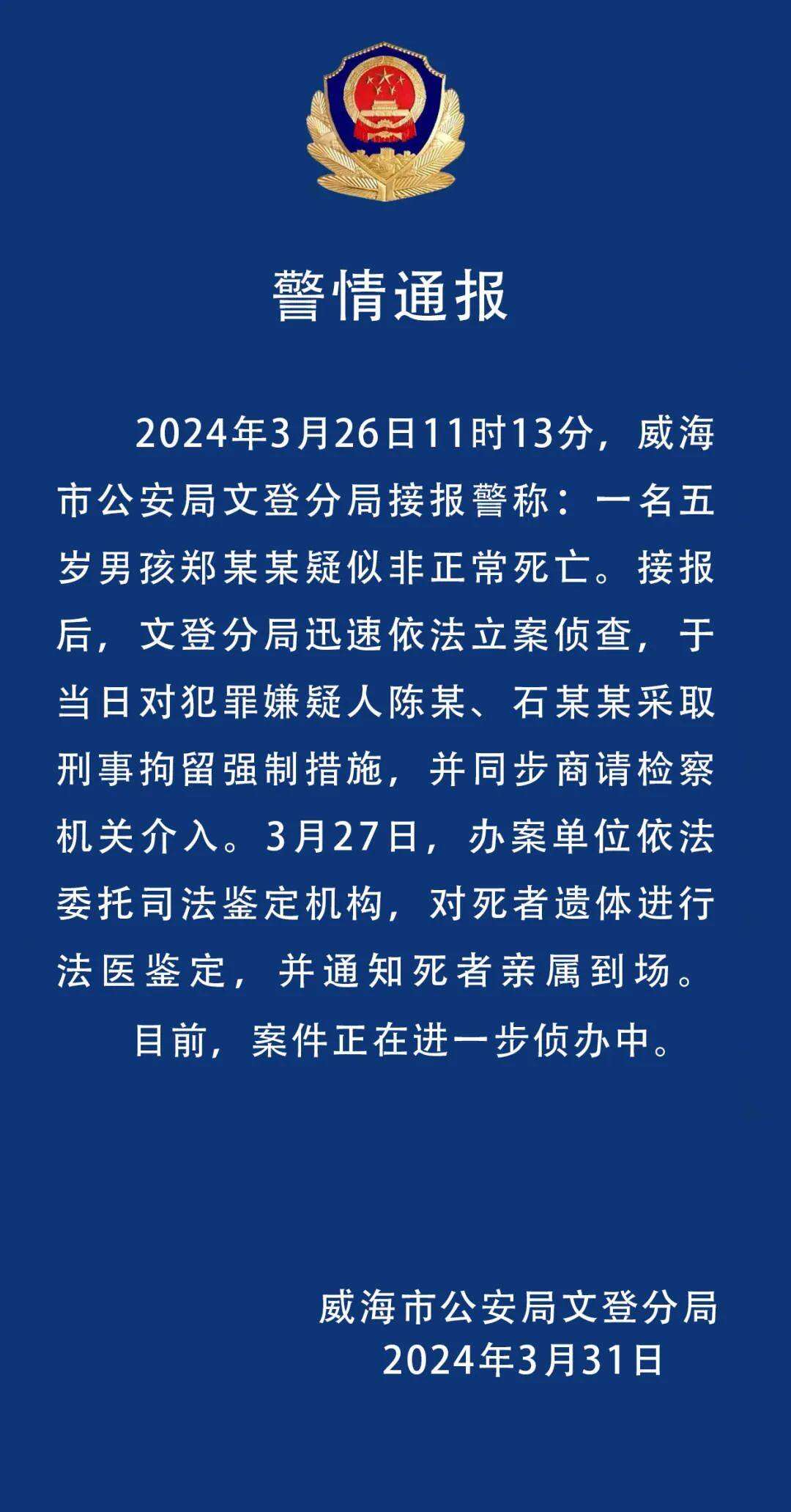 近日,山东威海一5岁男童疑被殴打致死。3月31日,当地公安局通报:男童生母与其男友被刑拘。