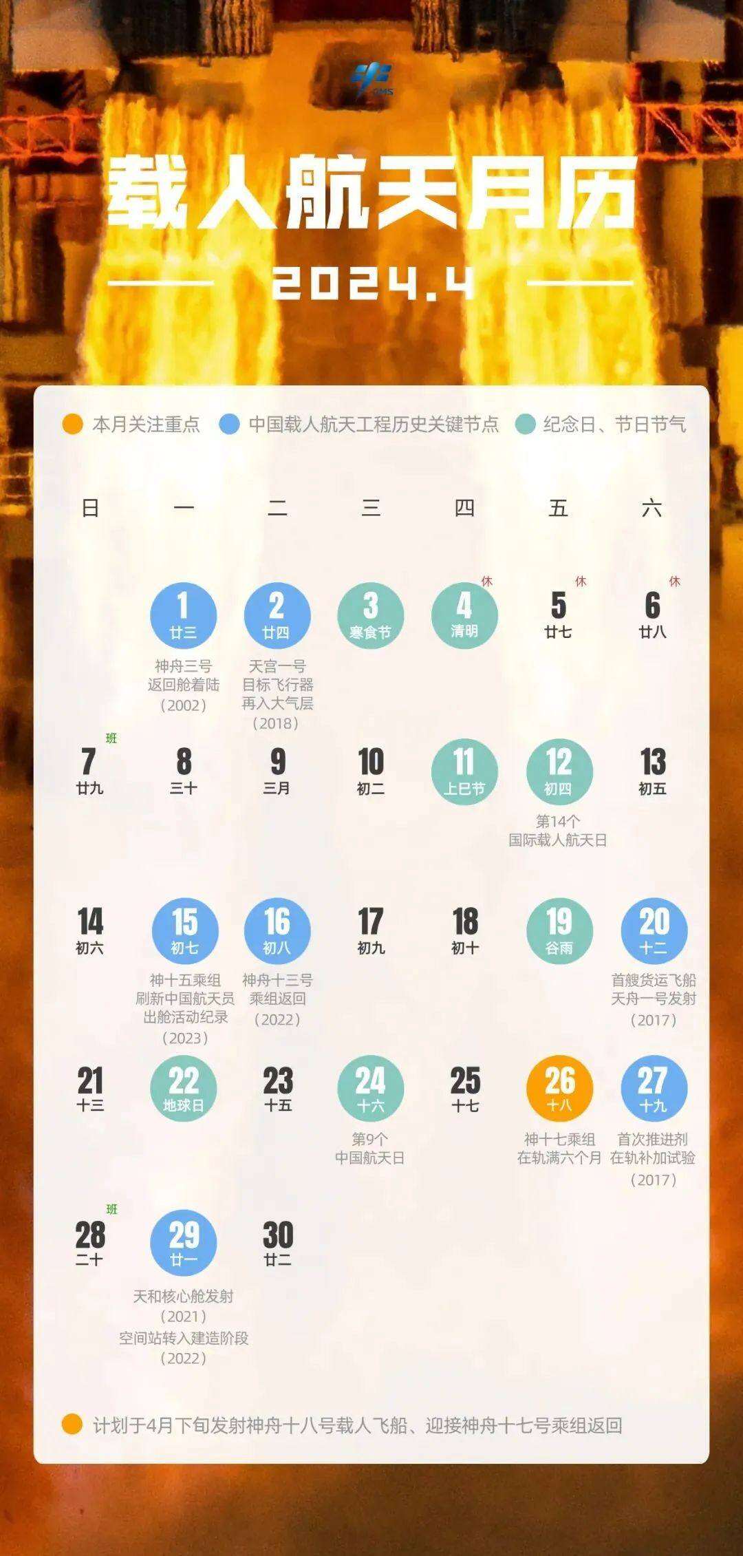 “中国载人航天”微信公众号31日公布2024年4月载人航天工程版月历,计划于4月下旬发射神舟十八号载人飞船、迎接神舟十七号乘组返回。