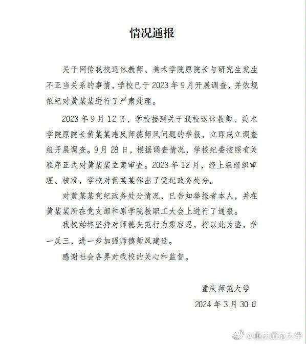 3月31日,重庆师范大学通报“高校老师诱骗女生当小三”:对黄某某作出党纪政务处分。