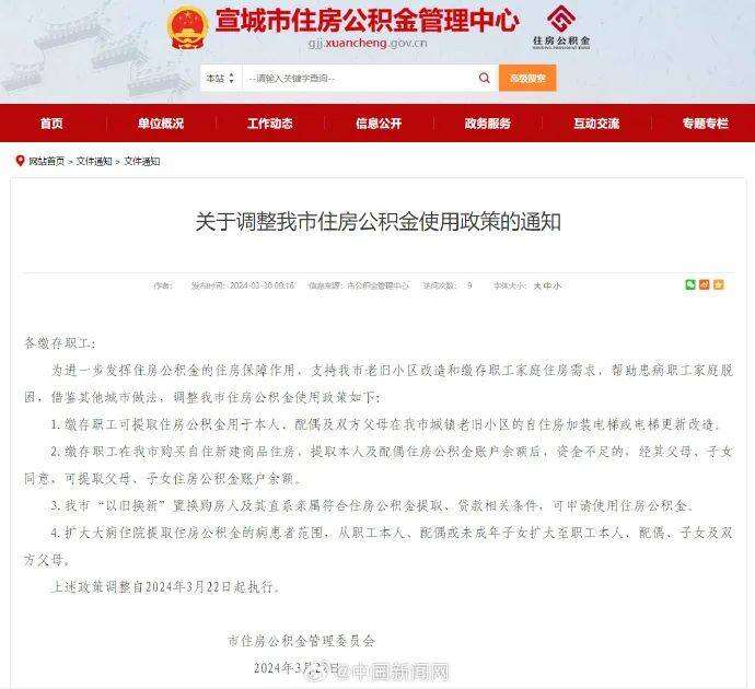 安徽宣城市住房公积金管理中心发布新政策,允许缴存职工在购买新建商品住房时使用父母、子女的公积金余额,同时扩大大病住院提取范围。