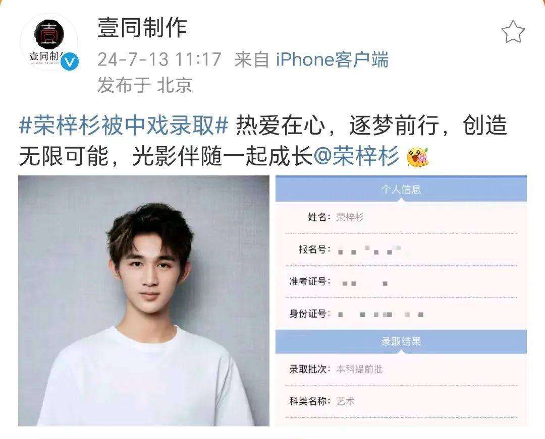 7月13日,青年演员荣梓杉的经纪公司“壹同制作”在微博透露,荣梓杉被中戏录取。