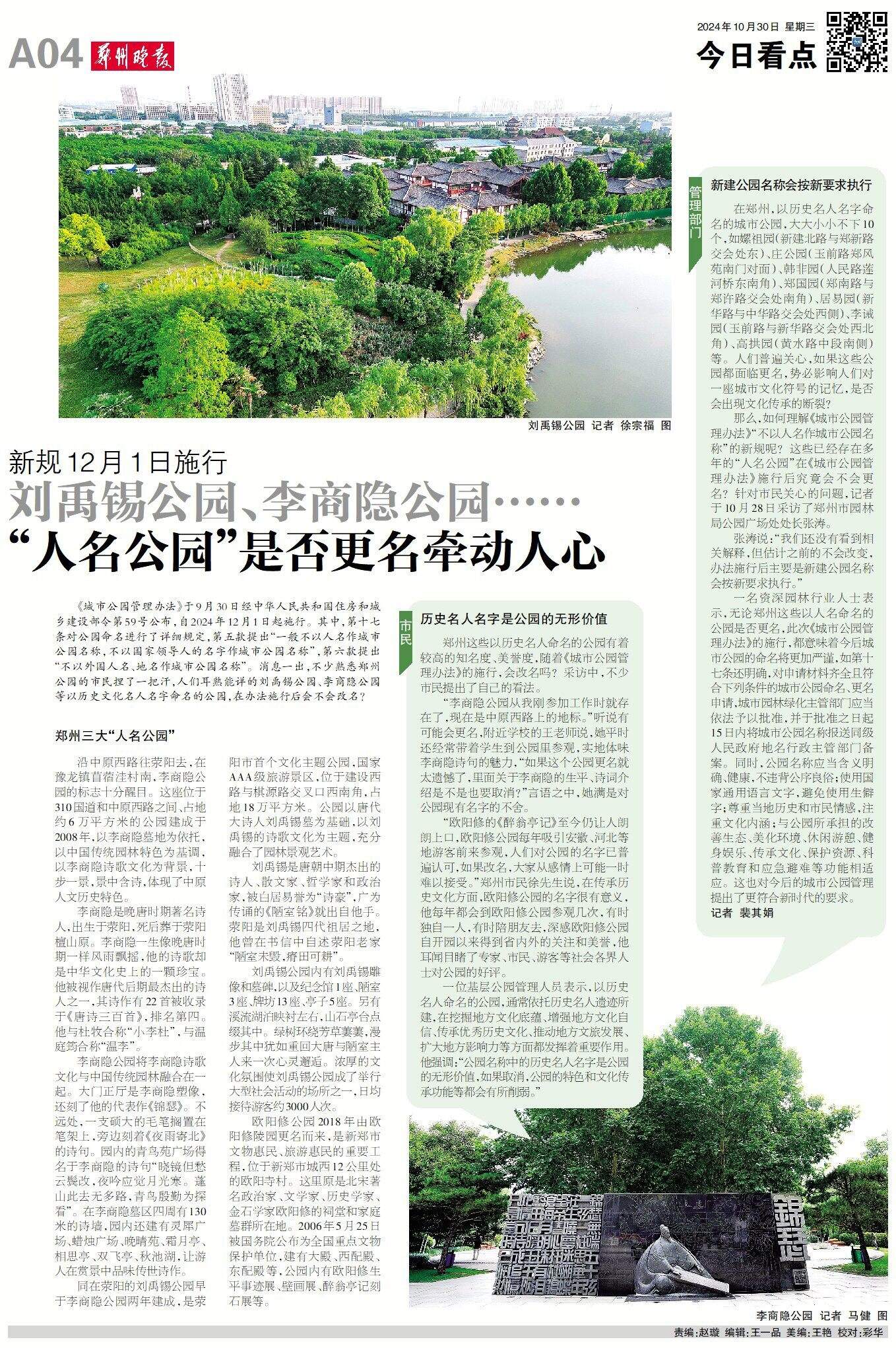 《城市公园管理办法》于9月30日经中华人民共和国住房和城乡建设部令第59号公布,自2024年12月1日起施行。其中,第十七条对公园命名进行了详细规定,第五款提出“一般不以人名作城市公园名称,不以国家领导人的名字作城市公园名称”,第六款提出“不以外国人名、地名作城市公园名称”。消息一出,不少熟悉郑州公园的市民捏了一把汗,人们耳熟能详的刘禹锡公园、李商隐公园等以历史文化名人名字命名的公园,在办法施行后会不会改名?