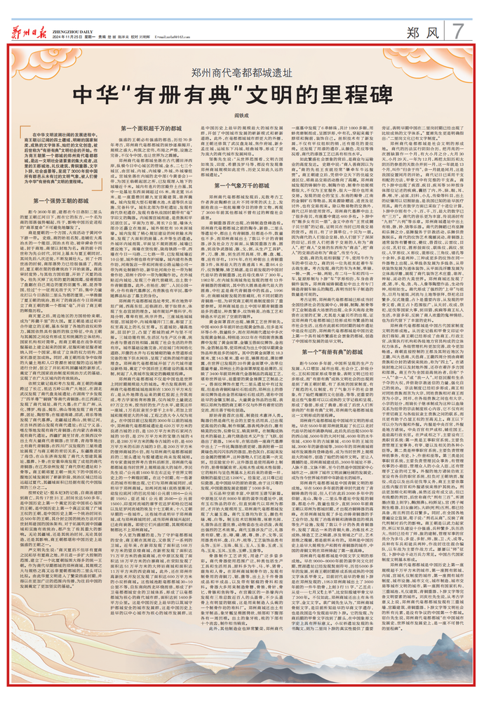 在中华文明波澜壮阔的发展进程中,商王朝以辽阔的四土疆域、明晰的国家制度、成熟的文字体系、灿烂的文化创造,被后世称为“有册有典”文明社会的开始。作为商王朝第一个都城的郑州商代亳都都城,是这一文明社会诸要素的集大成者,这里的王都城池、礼仪建筑、青铜重器、文字卜辞、社会盛景等,呈现了3000年前中国所有都邑从未有过的文明气象,被人们誉为中华“有册有典”文明的里程碑。