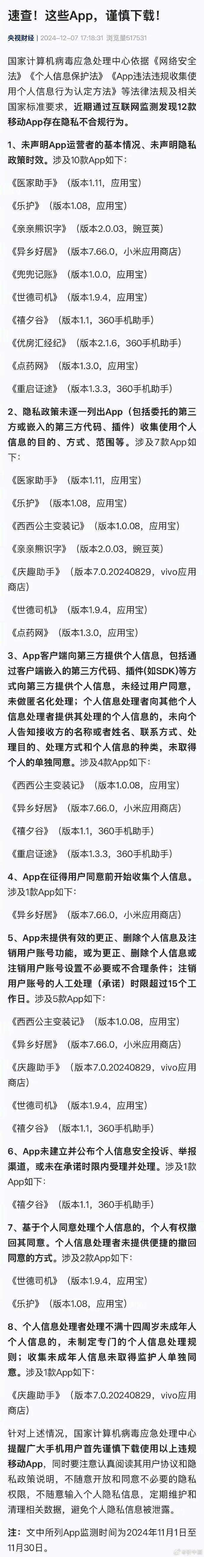 国家计算机病毒应急处理中心依据《网络安全法》《个人信息保护法》《App违法违规收集使用个人信息行为认定方法》等法律法规及相关国家标准要求,近期通过互联网监测发现12款移动App存在隐私不合规行为。