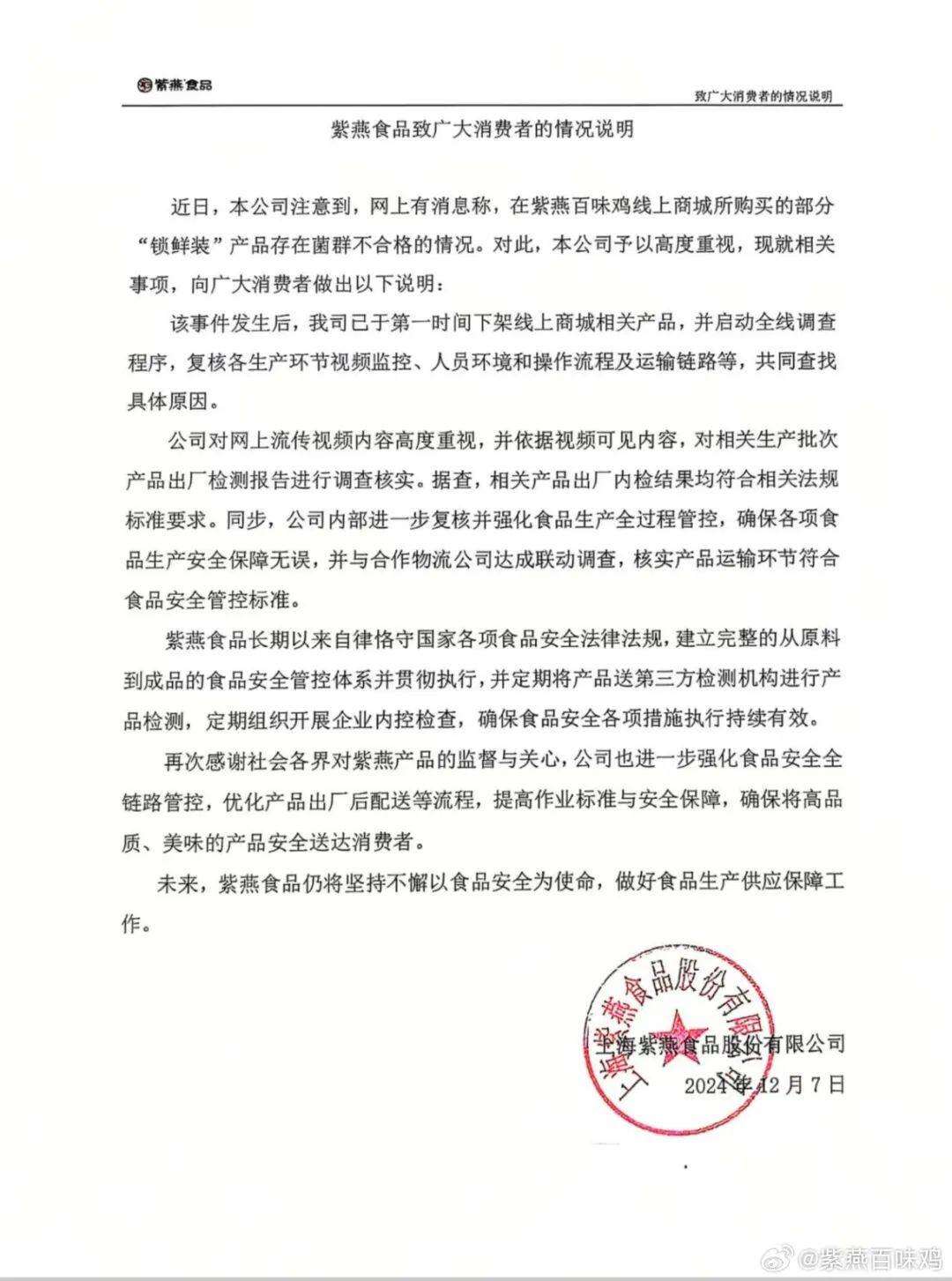 12月7日,微博话题#紫燕百味鸡回应大肠杆菌超百倍#登上热搜第一。紫燕百味鸡发布《紫燕食品致广大消费者的情况说明》表示,该事件发生后,公司已于第一时间下架线上商城相关产品。