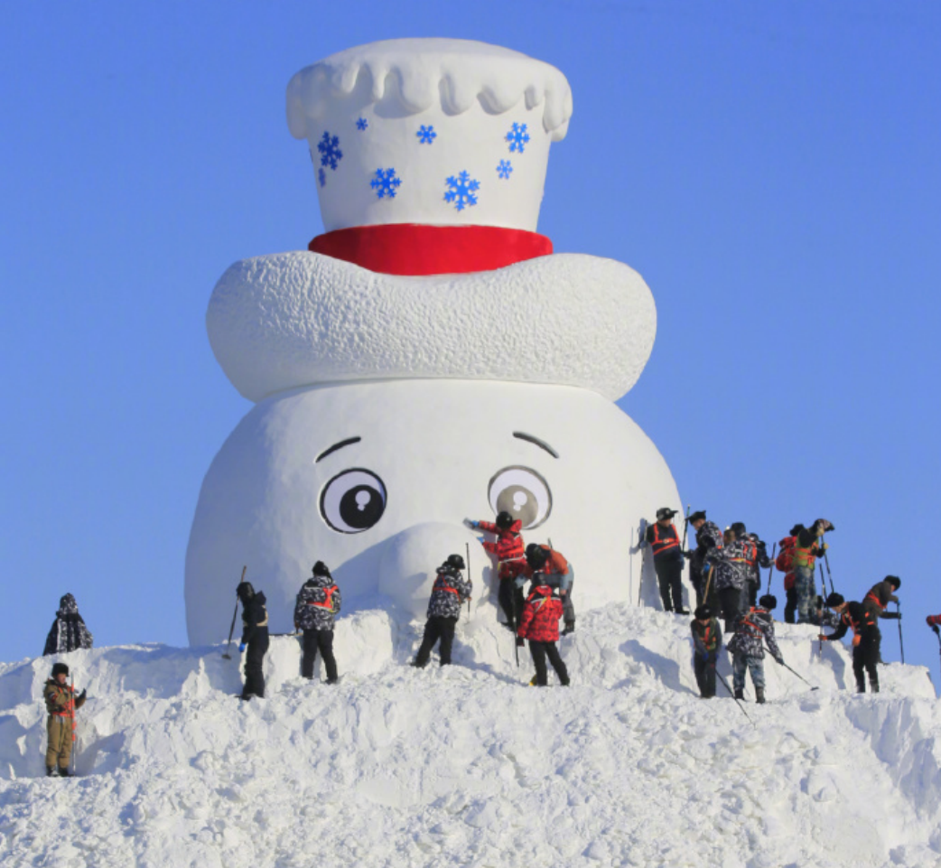 12月6日,哈尔滨,第37届太阳岛雪博会的网红大雪人“雪人先生”的面部雕刻完毕,“悟空归来”及“传奇圣火”也开始进行雕刻作业。