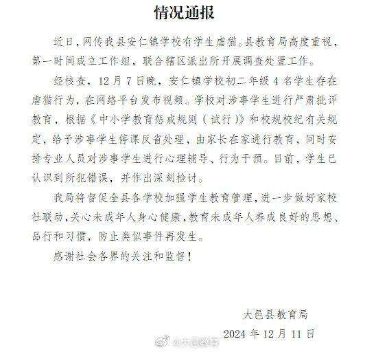近日,有网友反映,四川成都大邑县一学校四名初中生虐猫后,将视频发在网上。11日,四川成都大邑县教育局发布情况通报:涉事学生停课反省,安排心理辅导。