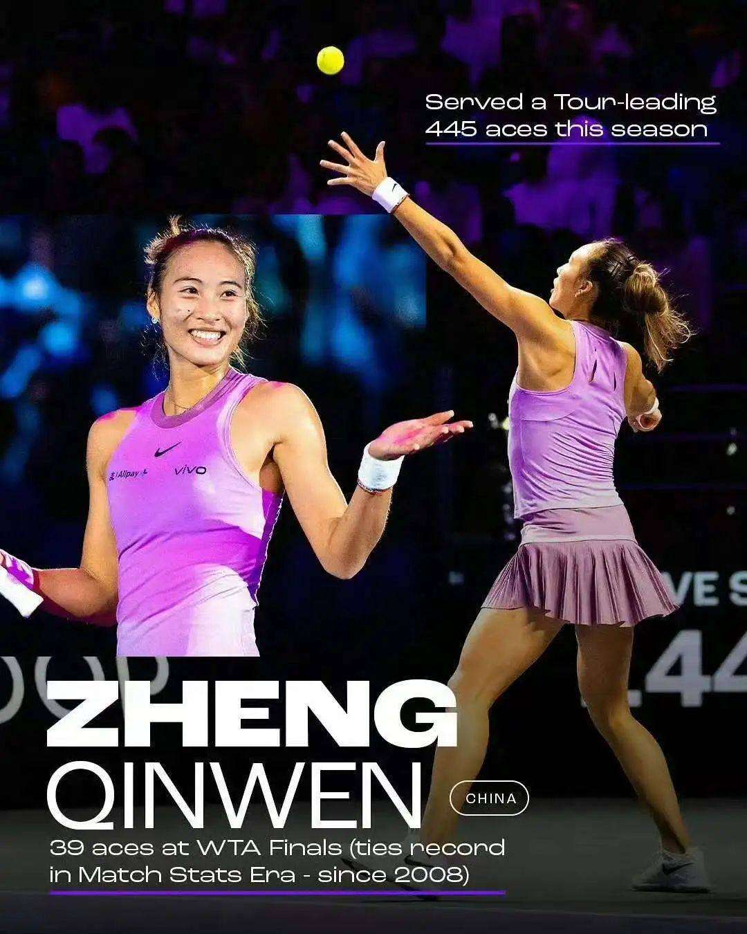 在WTA公布的2024年度球员技术统计中,中国球员郑钦文在ACE球排行榜上高居榜首,反映出本赛季她在发球环节的强势表现。郑钦文在2024年参加了68场比赛,共发出445记ACE球,成为今年发出ACE球最多的女球员。排名第二的莱巴金娜共发出358记ACE球。