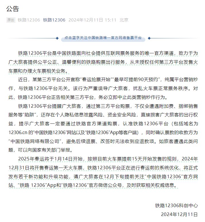 近日,某第三方平台公开宣称“春运抢票开始”“最早可提前90天预约”,纯属平台营销炒作,与铁路12306平台无关。对此,铁路12306平台正告相关第三方平台,务必立即中止此类营销炒作行为。