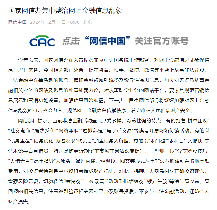 今年以来,国家网信办对网上金融信息乱象保持高压严打态势,会同相关部门处置一批在抖音、快手、微博、微信等平台上从事非法荐股、非法金融中介等活动的账号,清理金融领域引流类及诱导性违规信息,加大对无资质从事金融相关业务的网站及账号的处置处罚力度。