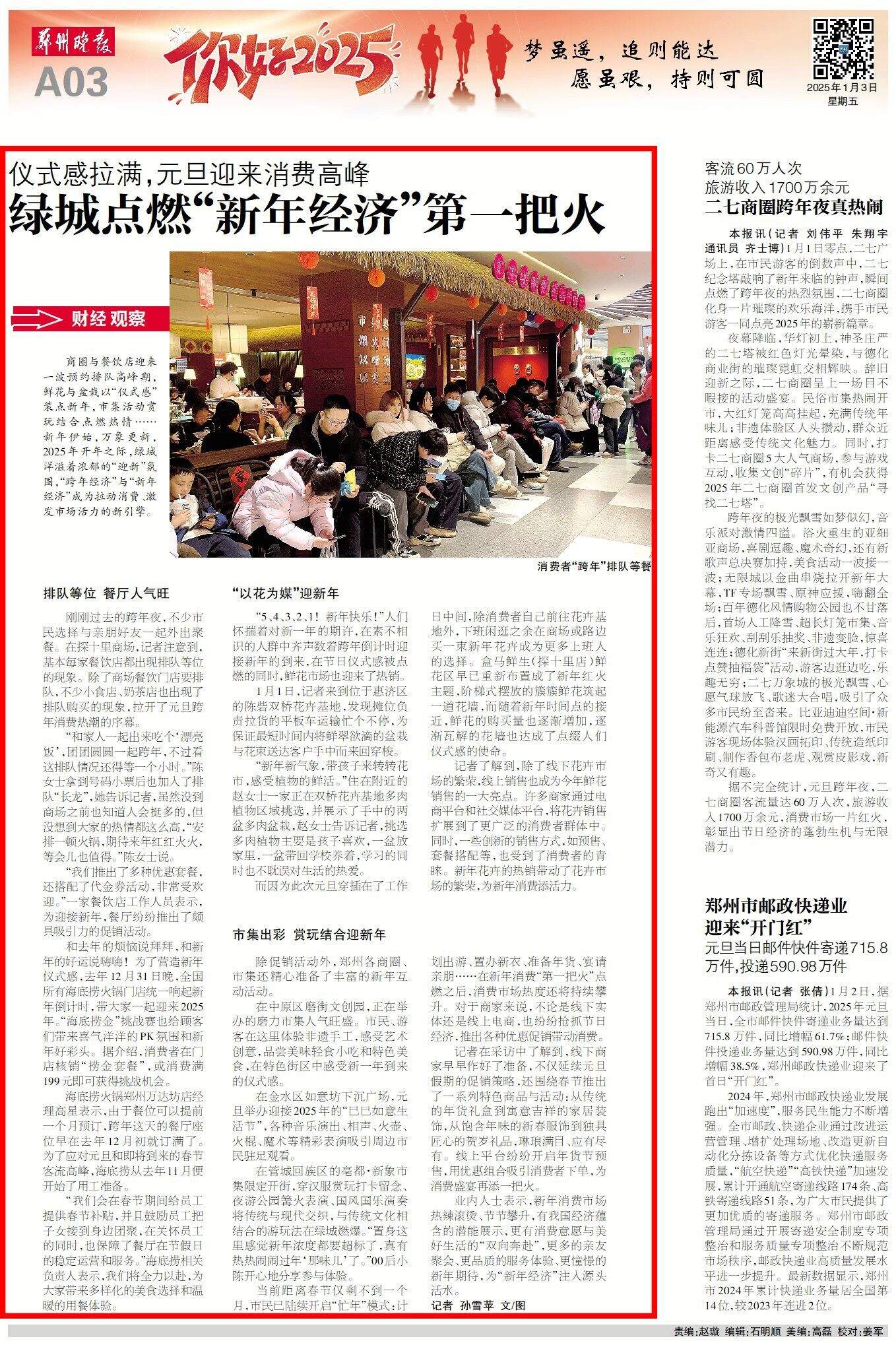 商圈与餐饮店迎来一波预约排队高峰期,鲜花与盆栽以“仪式感”装点新年,市集活动赏玩结合点燃热情……新年伊始,万象更新,2025年开年之际,绿城洋溢着浓郁的“迎新”氛围,“跨年经济”与“新年经济”成为拉动消费、激发市场活力的新引擎。