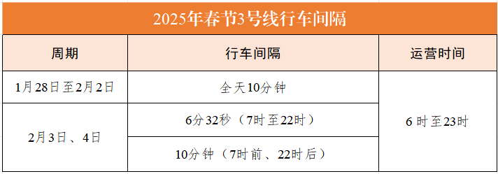 节日期间,郑州地铁3号线持续实施“橙跑计划”,半程首班车营岗站发车时间为5:00(开往海滩寺站),半程末班车省体育中心站/滨河新城南站发车时间为23:30(均开往营岗站),全程列车运营时间保持不变(6时至23时)。同时,科学安排行车间隔,1月28日—2月2日(除夕-初五),全天行车间隔10分钟,2月3日-2月4日(初六-初七)7时-22时行车间隔6分32秒,收发车时段(7时前、22时后)行车间隔10分钟。