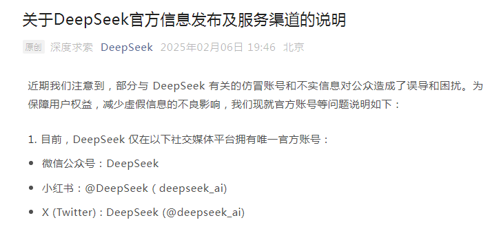 2月6日晚,DeepSeek官方微信公众号发文,说明并澄清近期市场上出现部分与DeepSeek有关的仿冒账号和不实信息。