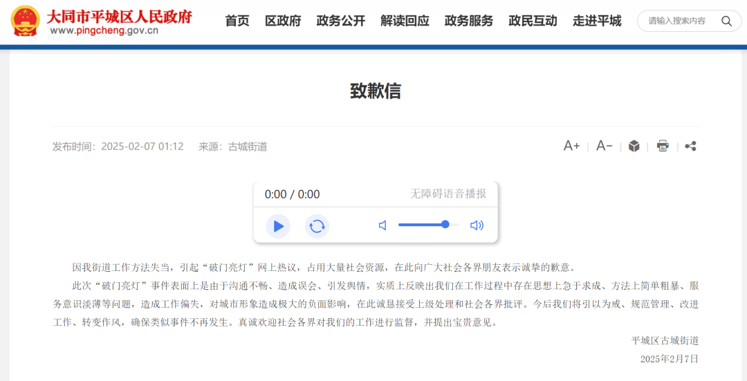山西大同平城区古城街道2月7日发布致歉信:因街道工作方法失当,引起“破门亮灯”网上热议,占用大量社会资源,在此向广大社会各界朋友表示诚挚的歉意。