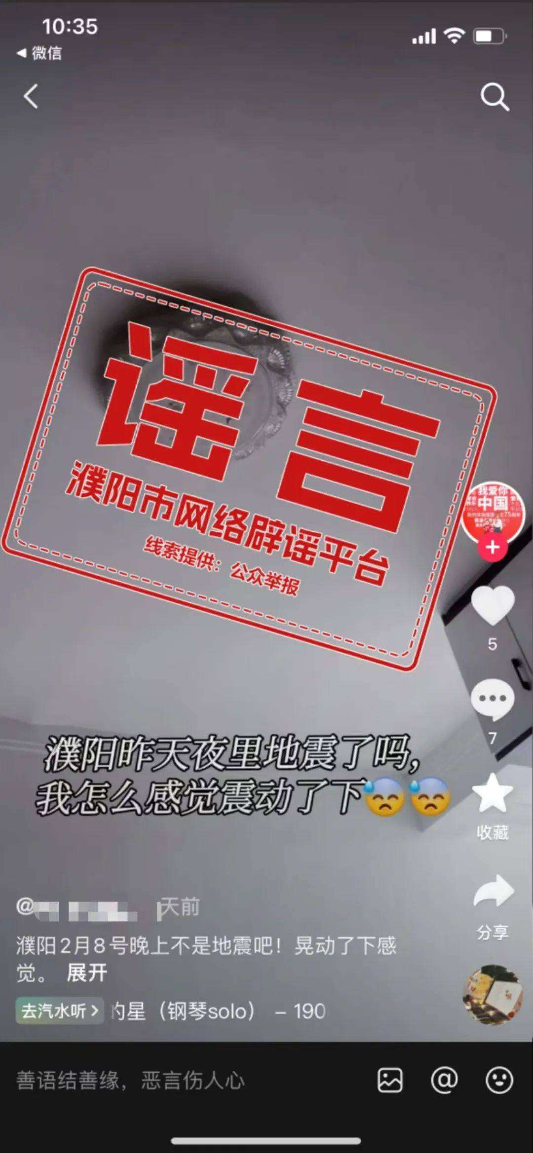 2月9日,账号“小**”“Q**”、“**麻麻”在网络视频平台发布“濮阳县八公桥镇六点五十五分地震了”“2月8日濮阳地震了”相关信息。经濮阳市委网信办向市防震减灾中心核实查证,2月8日至今,濮阳市周边100公里范围内未发生地震!消息为不实信息。