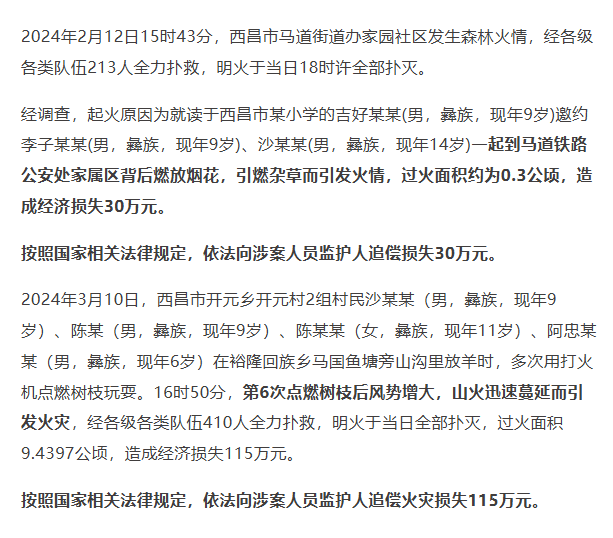 近日,四川西昌发布通报称,7名小孩放烟花、玩火引发森林火情,家长共赔偿145万元。