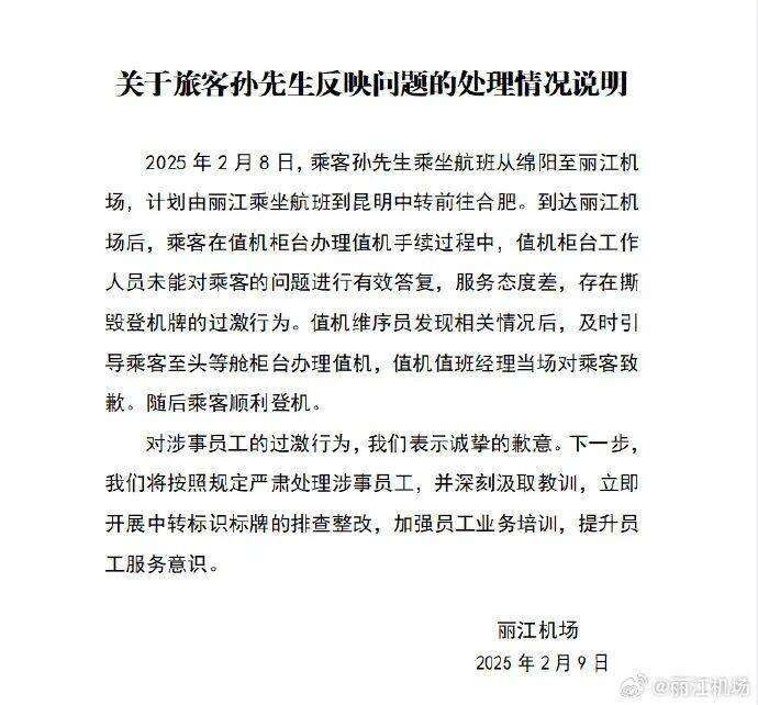 2月9日,云南丽江,有网友发视频称,其在云南丽江三义国际机场转机时与值机员发生口角,值机员撕掉其登机牌。当日晚,丽江机场发布情况说明就此事向乘客致歉,并表示将按照规定严肃处理涉事员工。