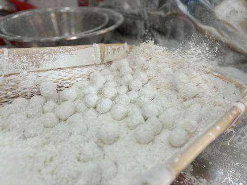 临近元宵节,位于汝河路上的老西郊周记手工石磨元宵开启了忙碌的节奏。只见元宵师傅将馅料蘸水后放入盛着干糯米粉的笸箩中反复推摇,经过多次的蘸水、沾粉后,元宵初具雏形,最后再放入机器中均匀裹粉并确认元宵的个头儿达标后,一颗颗饱满的元宵才算“滚”制而成了。