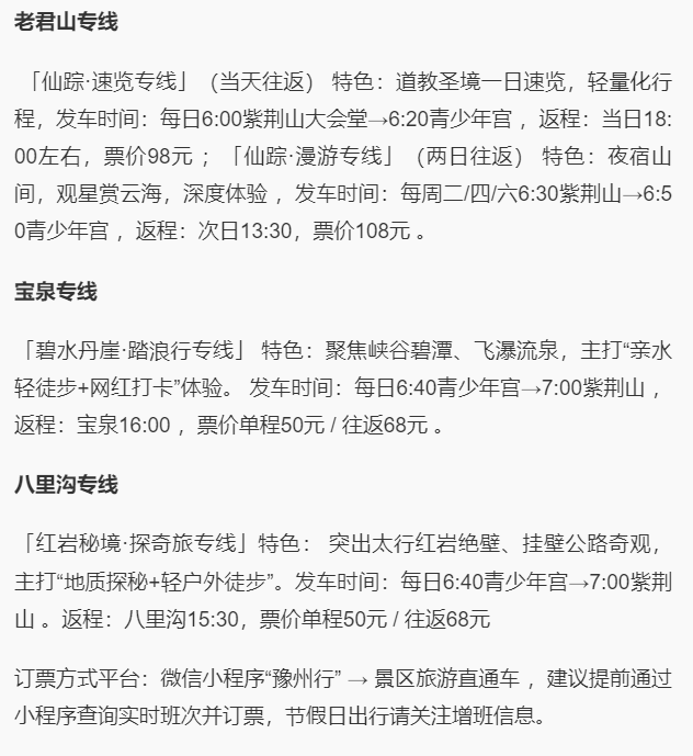 3月20日起,郑州交运集团正式开通宝泉、八里沟、老君山三大热门景区旅游直通车。