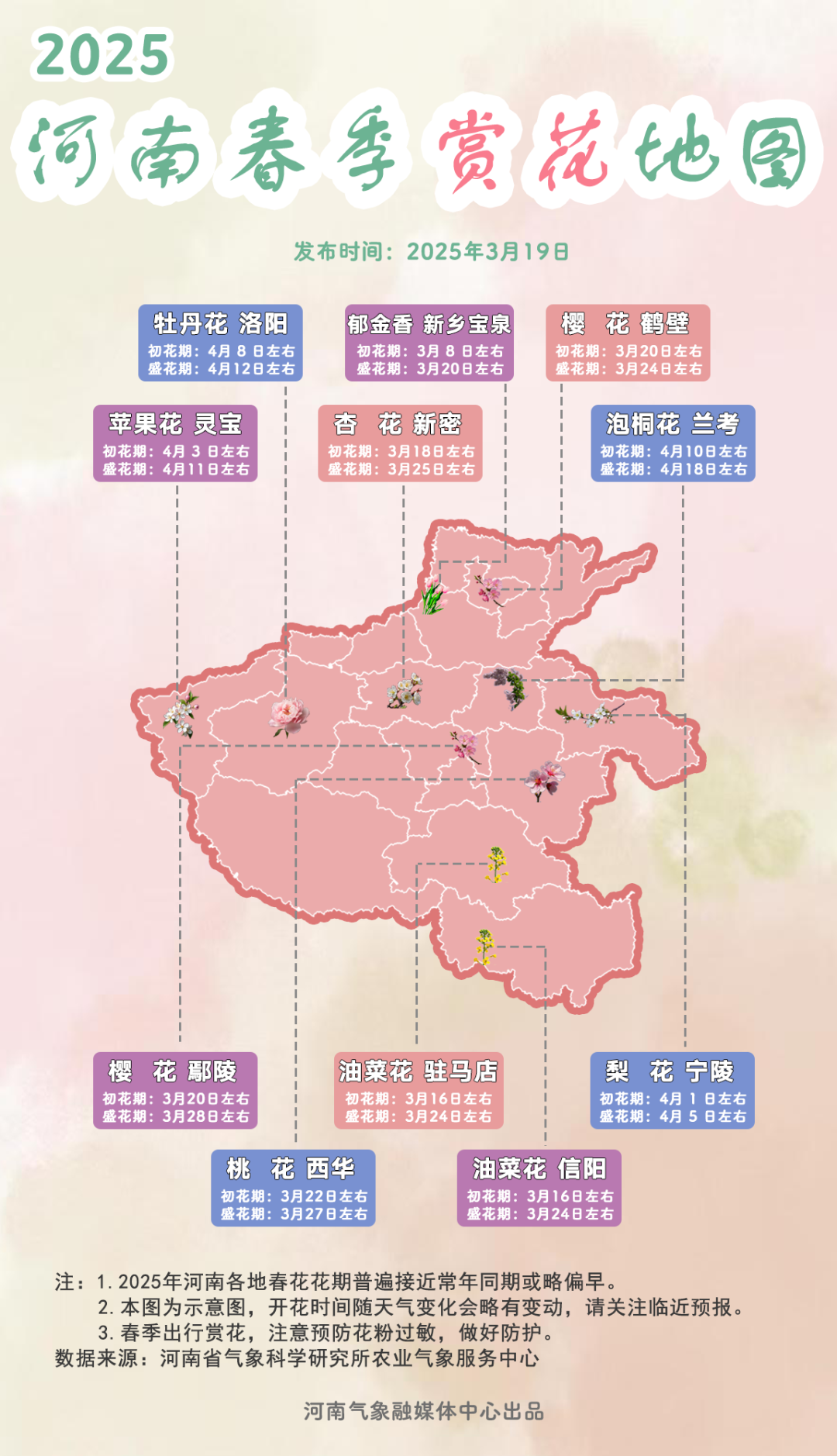 春天迈着轻盈的步伐来到我们的身边,万物复苏,百花齐放,浪漫至极,河南春季赏花地图新鲜出炉!受西北气流影响,未来三天我省仍多大风天气。明天到21日,中西部、西北风阵风6到7级。未来一周,最高气温稳步攀升,本周末大部地区最高气温超25℃。