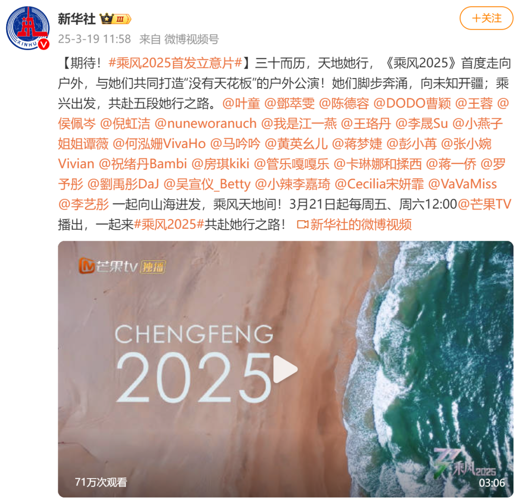 3月19日,《乘风2025》官宣全阵容并宣布定档3月21日。本季有叶童、邓萃雯、陈德容、曹颖等资深艺人首度加盟。