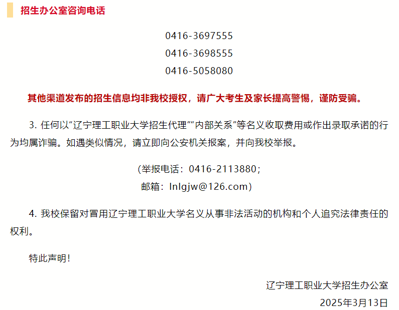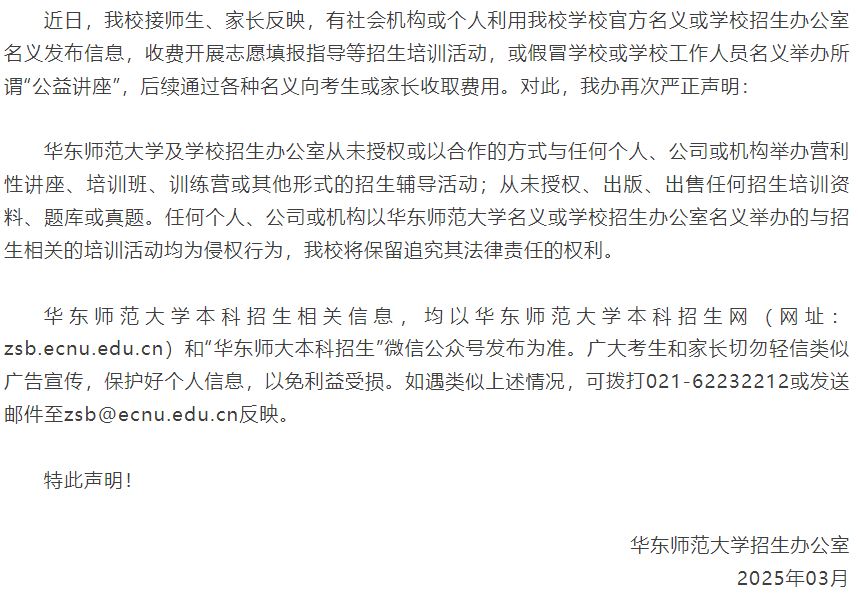 近期,部分社会机构及个人公然以高校名义,发布一系列不实信息,包括收费开展志愿填报指导、举办盈利性培训,甚至宣称能够提供“特殊录取名额”。多所高校通过官方渠道发表声明,郑重提醒广大考生及家长切勿轻信这些虚假宣传,谨防陷入诈骗陷阱,切实维护自身的合法权益。