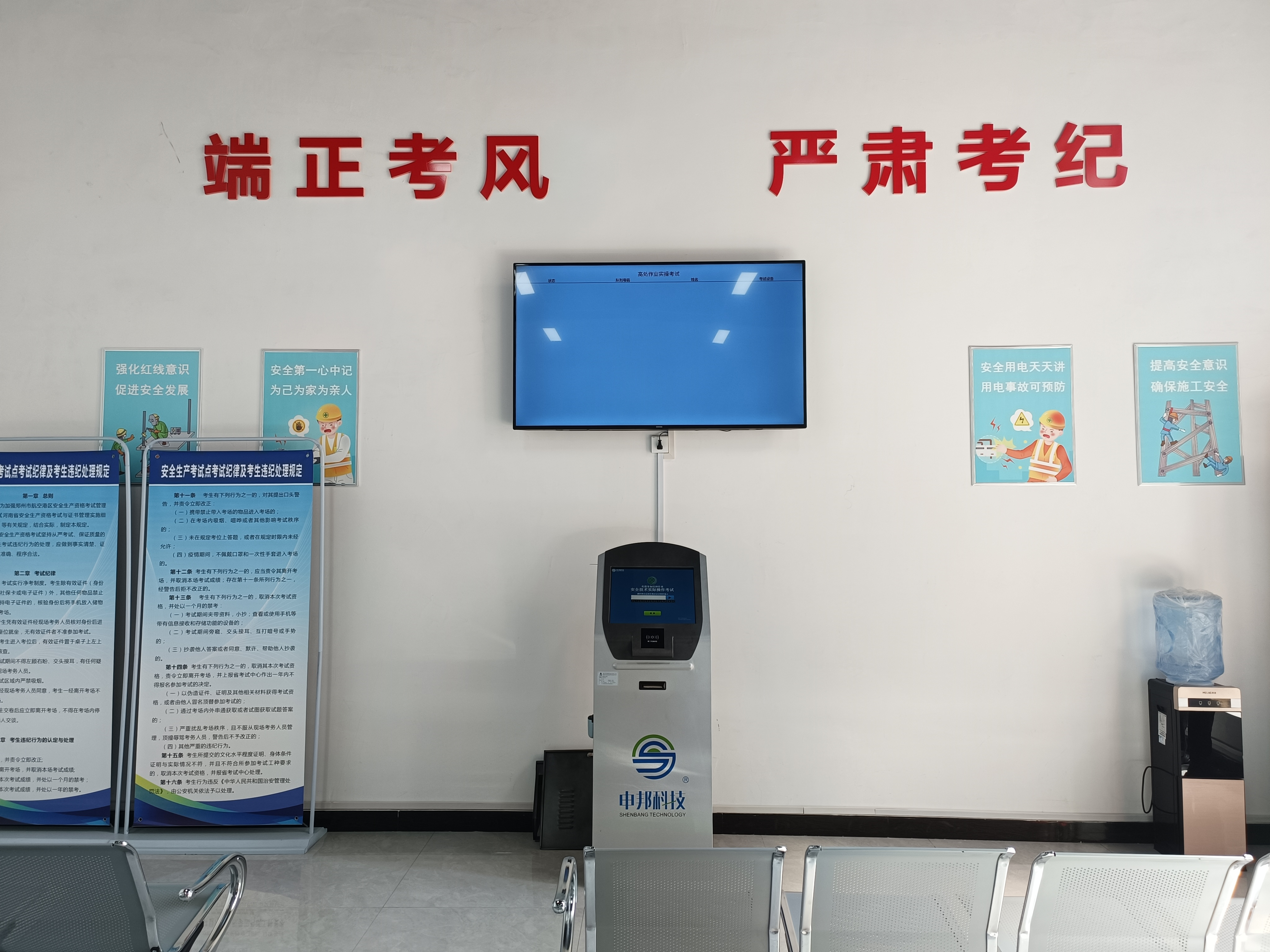 学员待考区则贴心地配备了休息座椅、饮水设施以及考试相关的宣传资料,让考生在等待考试的过程中,既能放松心情,又能进一步了解安全生产知识。