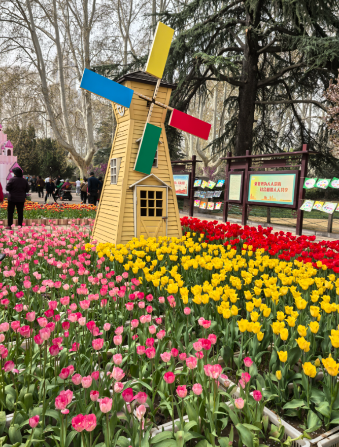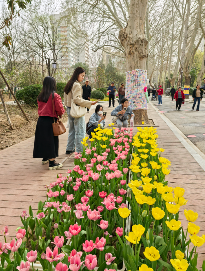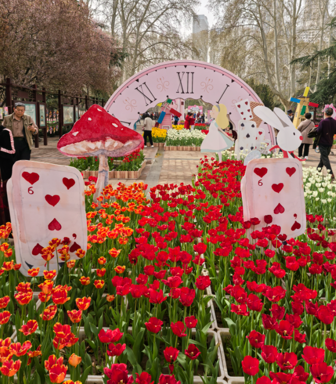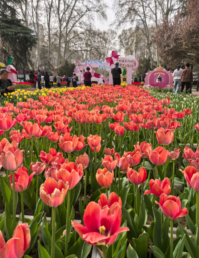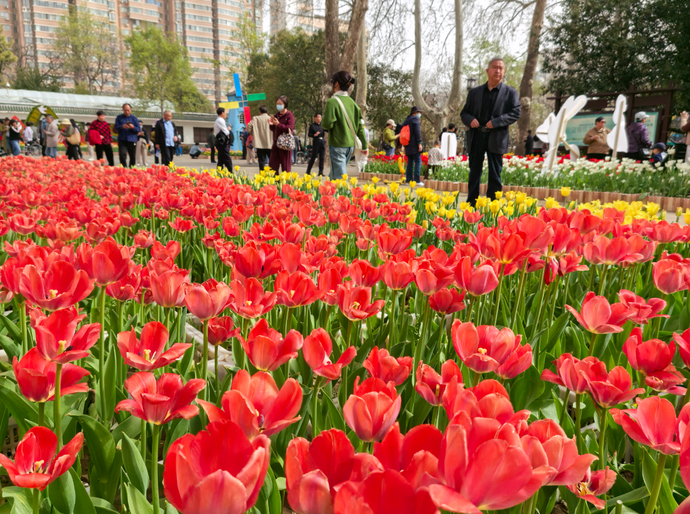 为烘托花展氛围,人民公园还运用8万盆草花,在公园主要节点打造了景观小品。郁金香花展期间,人民公园内38个品种、700余株樱花也竞相绽放,园区南部还有桃花、海棠等多种花卉同时绽放,与郁金香相互映衬,构成了一幅绝美的春日画卷。
