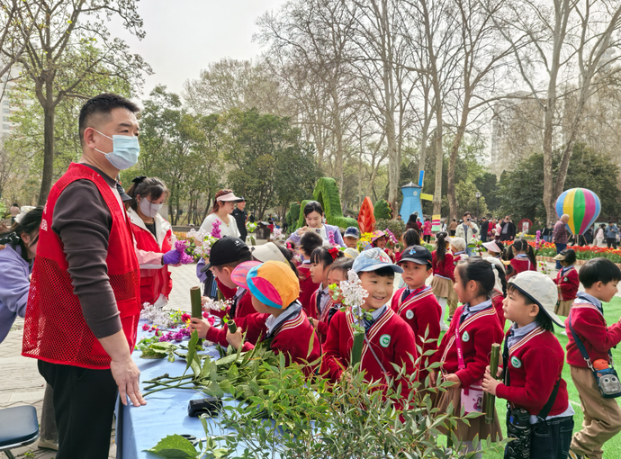 郁金香花展开幕当天,市人民公园还举办了“郁见春光 童趣盎然”自然科普课堂,邀请221名儿童参与“郁见春光・童心手绘”“樱花地绘”“郁金香盆栽制作”“郁樱有声科普”“春日游园”等活动,让孩子们在亲近自然的过程中感知生命之美,在动手实践中树立生态文明意识。