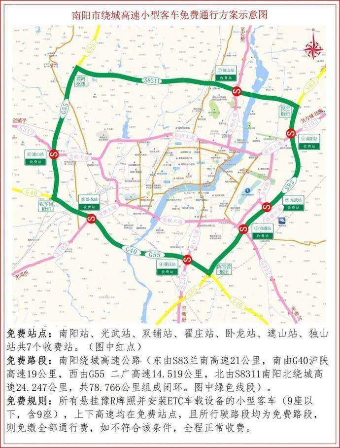 免费站点:南阳站、光武站、双铺站、翟庄站、卧龙站、遮山站、独山站共7个收费站。