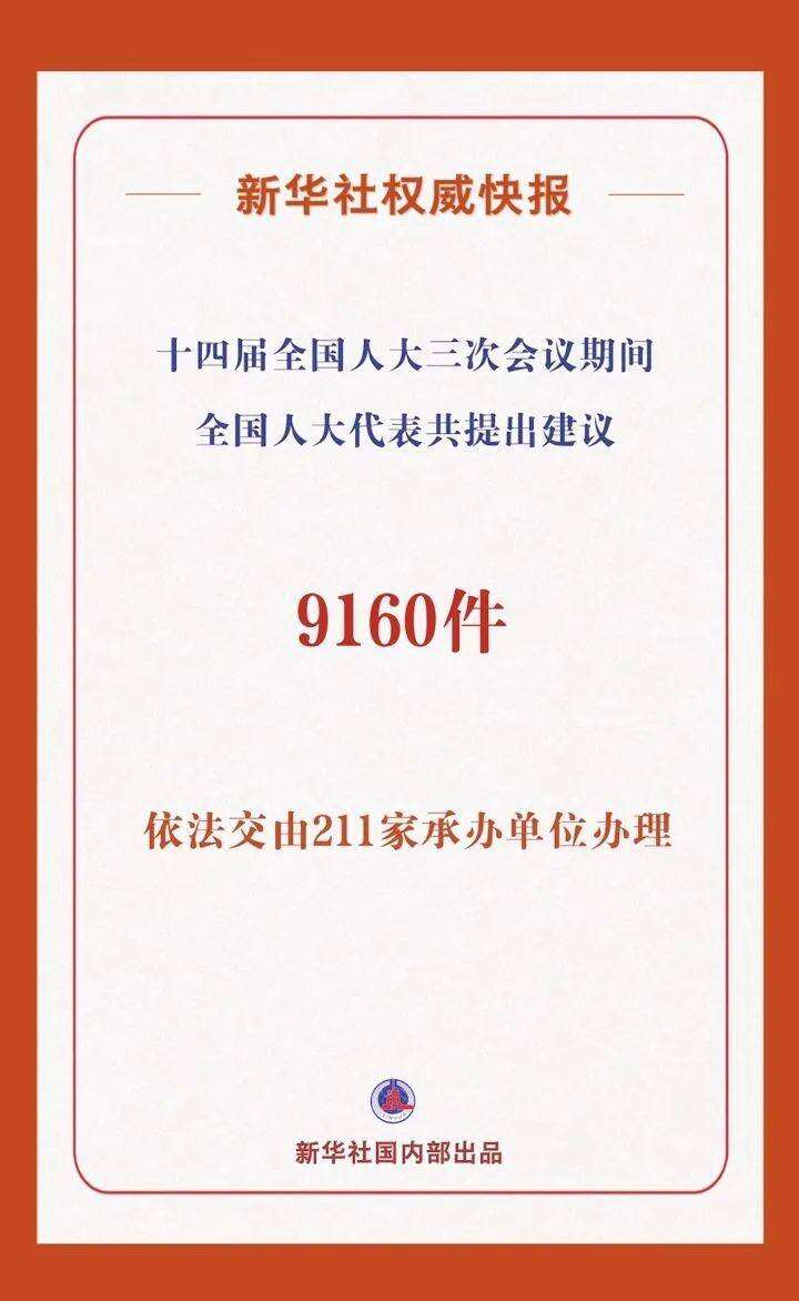 十四届全国人大三次会议代表建议交办会3月26日召开。据悉,十四届全国人大三次会议期间全国人大代表共提出建议9160件,全国人大常委会代表工委会同有关方面进行认真梳理和综合分析,依法交由211家承办单位办理。