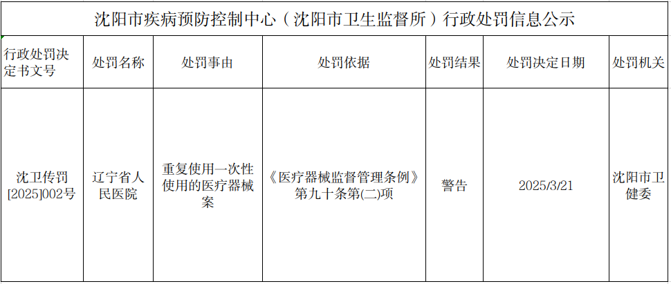 3月25日,据沈阳市疾病预防控制中心(沈阳市卫生监督所)行政处罚信息公示,辽宁省人民医院因重复使用一次性医疗器械被警告。