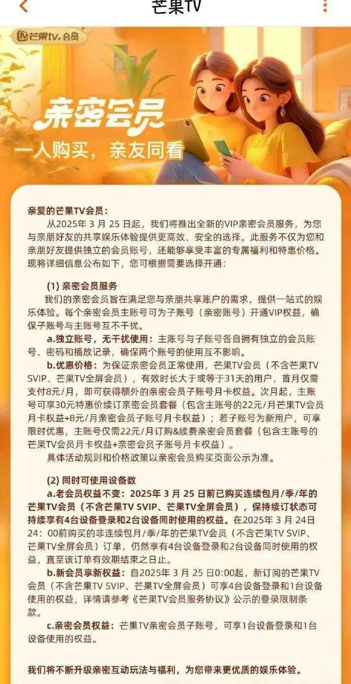 近日,有网友发现芒果TV调整了会员可同时使用设备数,3月25日后新订阅的芒果TV会员,同时使用设备数量由原来的2台改为1台。