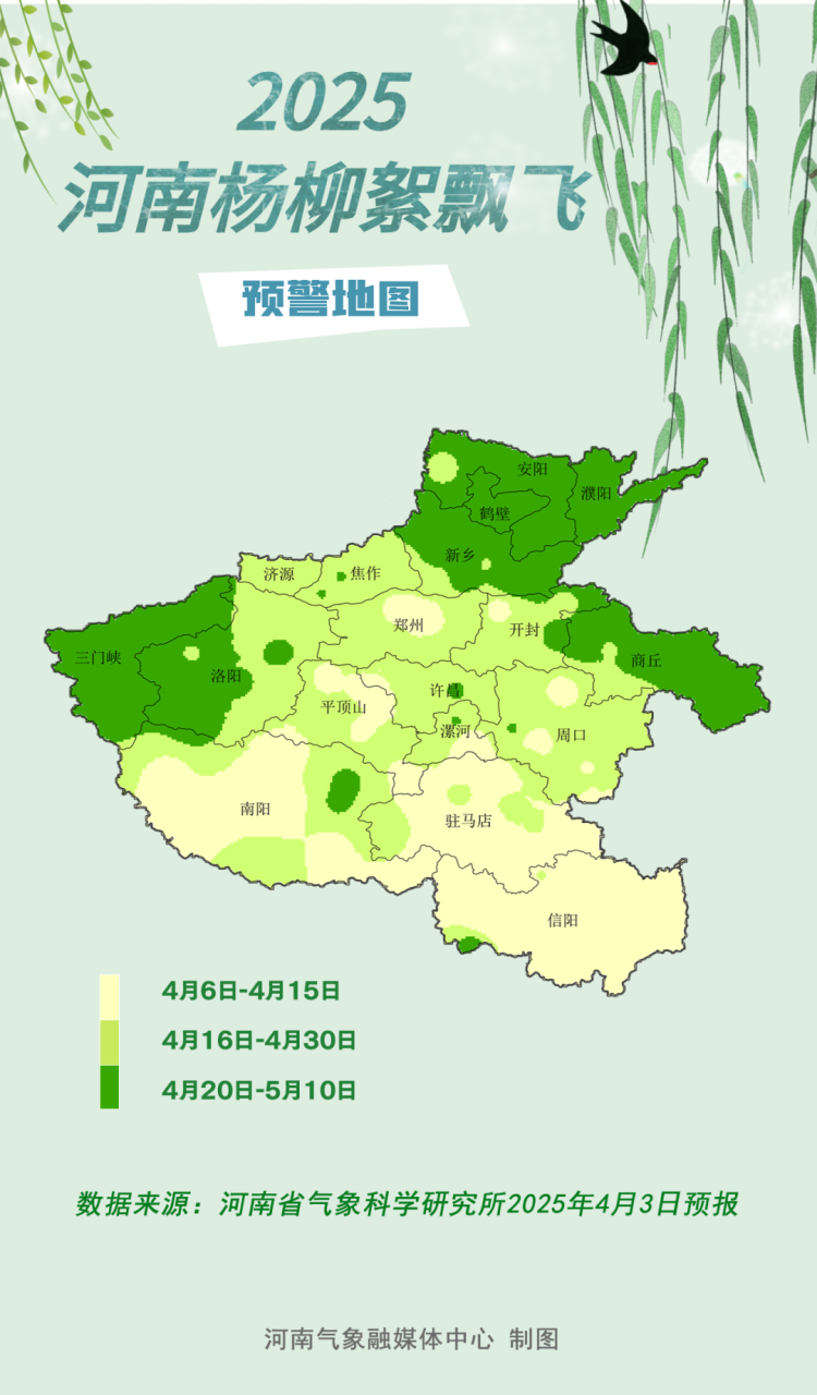 近日, 河南省气象服务中心 河南省气象科学研究所联合发布#2025河南杨柳絮飘飞预警地图。其中,预计郑州市区杨柳絮盛飞期为4月11日~25日;城郊盛飞期为4月12日~28日,总体持续时间15~30天。