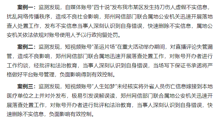 近日,为深入推进“清朗·系列”专项行动,强化“自媒体”治理工作,郑州网信、公安等部门强化联动,依法依规查处一批违法违规“自媒体”账号。现公开通报3起典型案例: